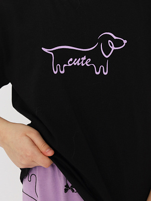 Комбинированная пижама из футболки и брюк. Футболка гладкокрашенная, свободного покроя с коротким рукавом. Горловина обработана притачной бейкой из рибаны с лайкрой. Перед оформлен небольшим принтом. Прямые брюки умеренного объёма выполнены из набивного полотна дополнительного цвета. Цельнокроенный пояс обработан плоским швом вподгибку с одновременным прокладыванием резинки.
