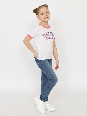 Футболка для девочки с трендовым колледж-принтом, с блестящим эффектом и контрастными бейками по горловине и рукавам. Модель сделана из 100%-хлопкового трикотажа. Материал приятно прилегает к телу, не сковывает движения и позволяет коже дышать.