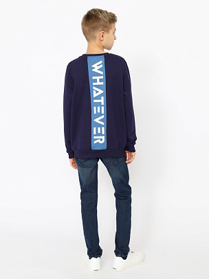 Джемпер для мальчика с длинными рукавами и притачным поясом. Воротник, манжеты и пояс выполнены из полотна с эластаном. Перед и спинка джемпера со вставками контрастного цвета. Вставки декорированы принтами. На пояс спереди настрочена декоративная жаккардовая этикетка.