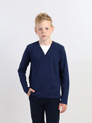 Джемпер с длинным втачным рукавом. Воротник с вырезом и имитацией футболки, по краю ланки воротника расположены декоративные пуговицы.