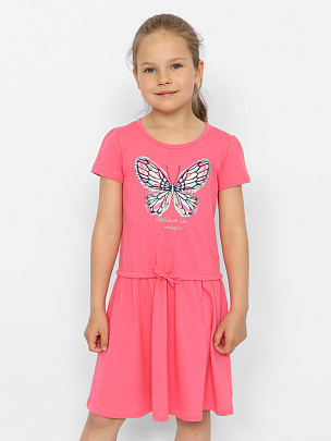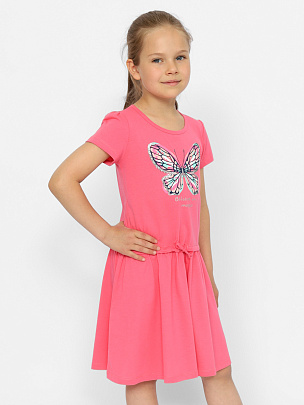 Платье для девочки с отрезной юбкой и кулиской со шнуром по шву притачивания юбки. Рукава короткие, со сборкой по окату. Горловина круглая, окантована бейкой из основного полотна. Перед платья декорирован принтом с вышивкой пайетками.