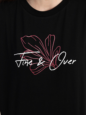 Футболка oversize с короткими рукавами. Горловина круглая, обработана притачной бейкой из рибаны с лайкрой. Перед футболки декорирован принтом с использованием глиттера.
